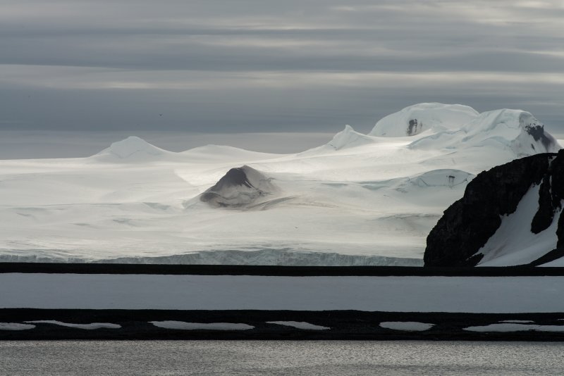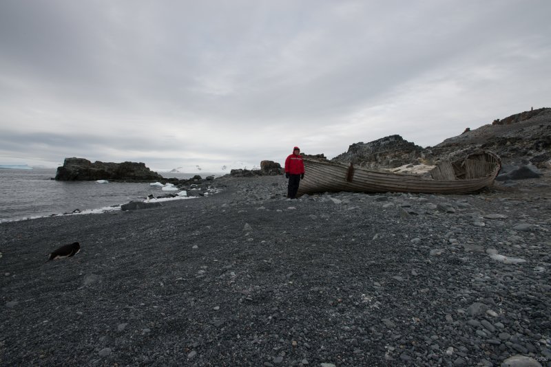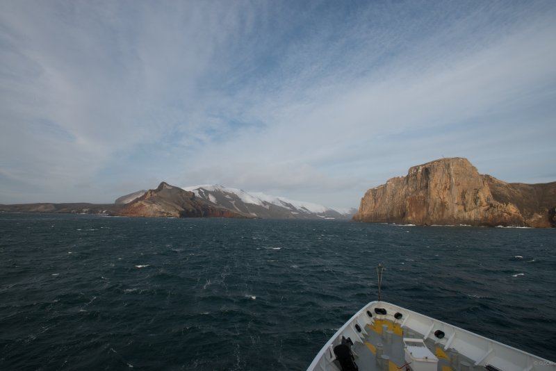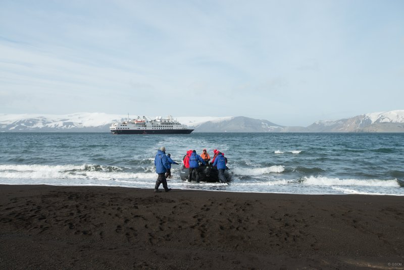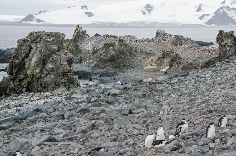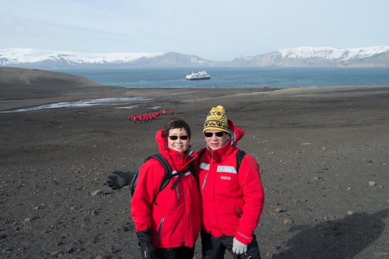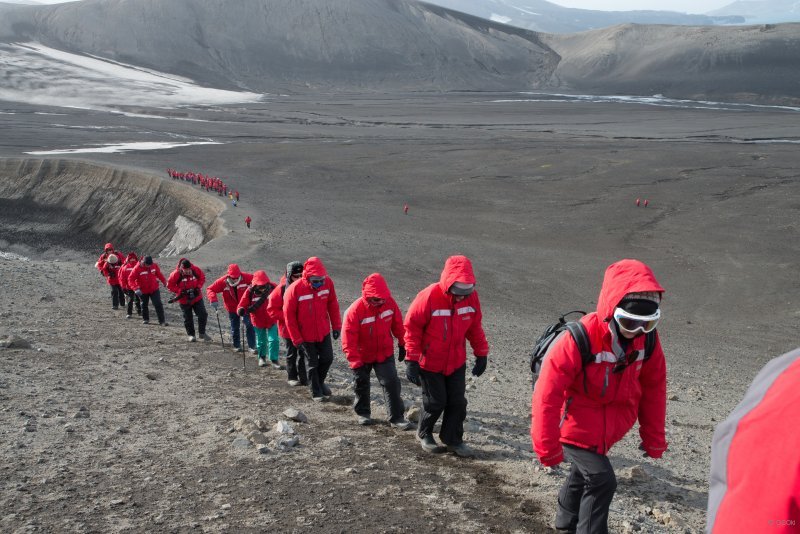Deception Island surrounds the caldera of an active volcano, where one section of its rim has collapsed into the sea. The caldera, which is 5.6 miles long and 3.7 miles wide, was filled by the Antarctic Sea forming a bay named Port Foster. The entrance to the bay is via a narrow, 755 foot channel called Neptune’s Bellows. We landed on the north side of the caldera in Telefon Bay. From our landing point we hiked up the ridge to a small lake, continued along the ridge, and then descended down to the beach about a quarter mile to the west of our landing point. It was roughly a 2.5 miles hike. We were fortunate that the weather was clear.